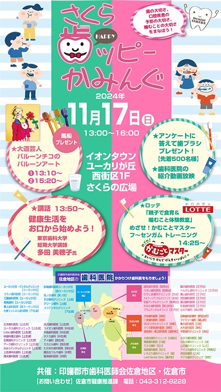 11月17日(日)イオンタウンユーカリが丘にて、佐倉地区歯科医師会と佐倉市主催の『さくら歯ッピーかみんぐ』が開催されます。